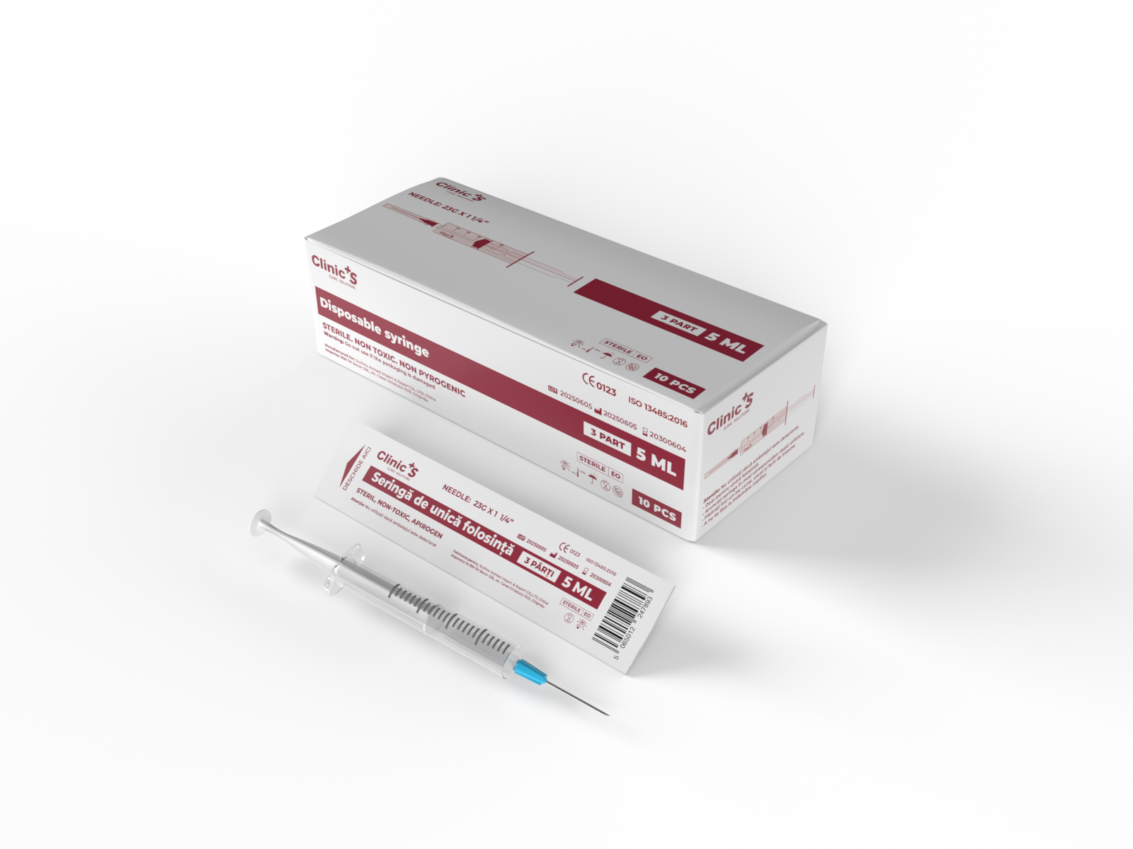 Disposable syringe, 3 Part, 5 ML - 10 PCS Sterile. Non Toxic. Non Pyrogenic. WARNINGS For external use only.To be used for local disinfection. Disposable.Store in a dry place, away from light.